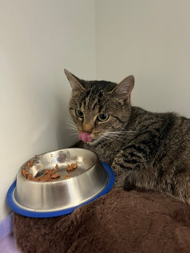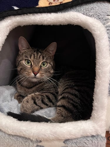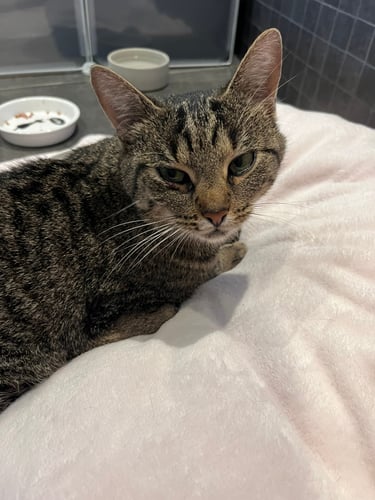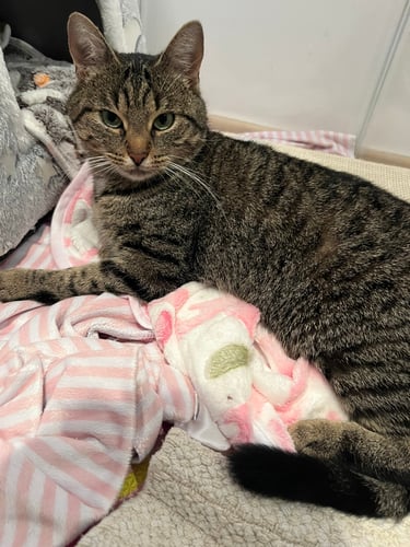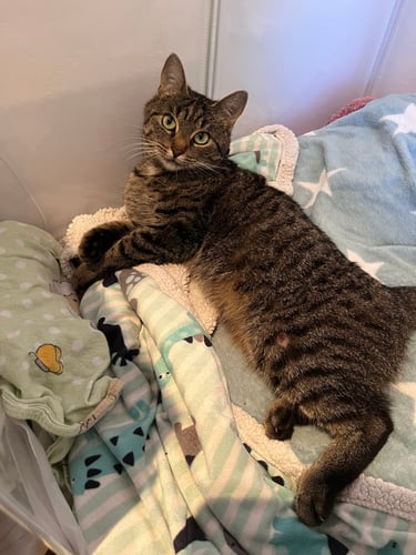 Nola kam nach einem Autounfall im Oktober 2024 zu uns. Durch den Unfall wurden ihre Brustwirbel verschoben und leider auch ihre Nerven beeinträchtigt, was dazu führte, dass sie nicht mehr laufen und selbstständig keinen Urin mehr absetzen kann. Deshalb braucht sie aktuell intensive Pflege und Betreuung.